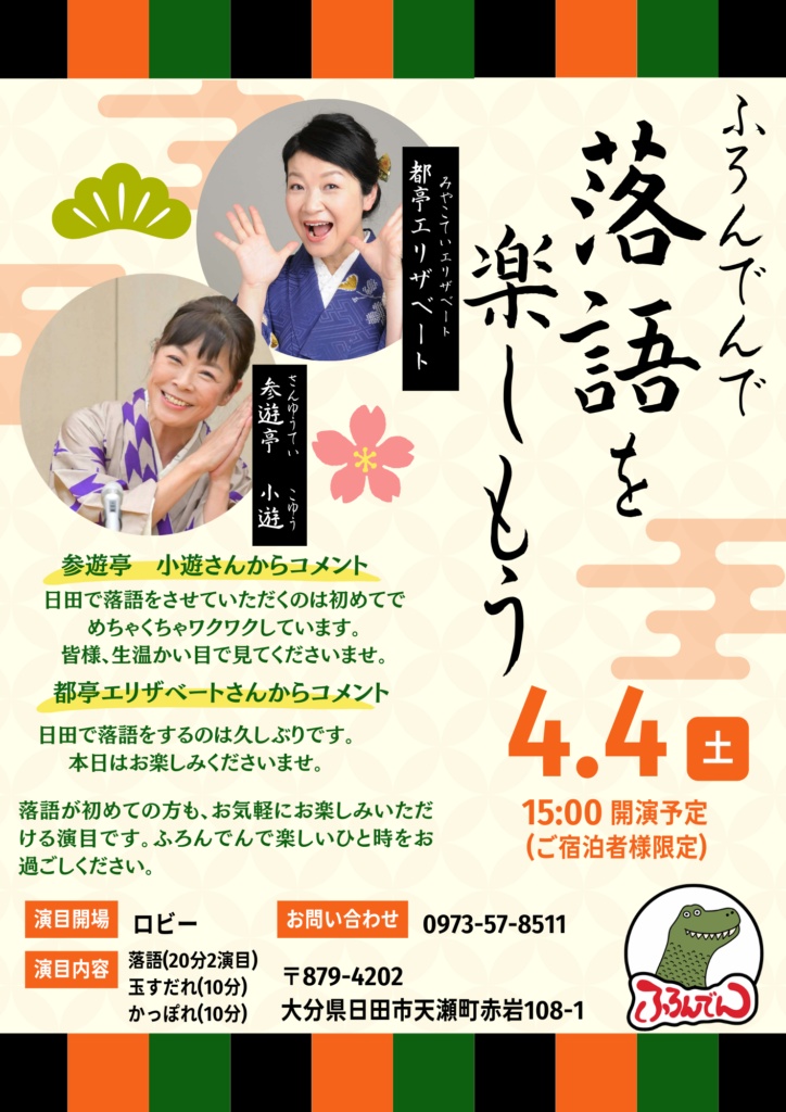 都亭エリザベートさん、参遊亭小遊さんによる落語会を4月に開催いたします。