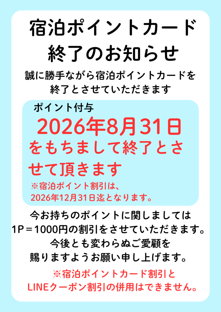 誠に勝手ながら宿泊ポイントカードを終了とさせていただきます。