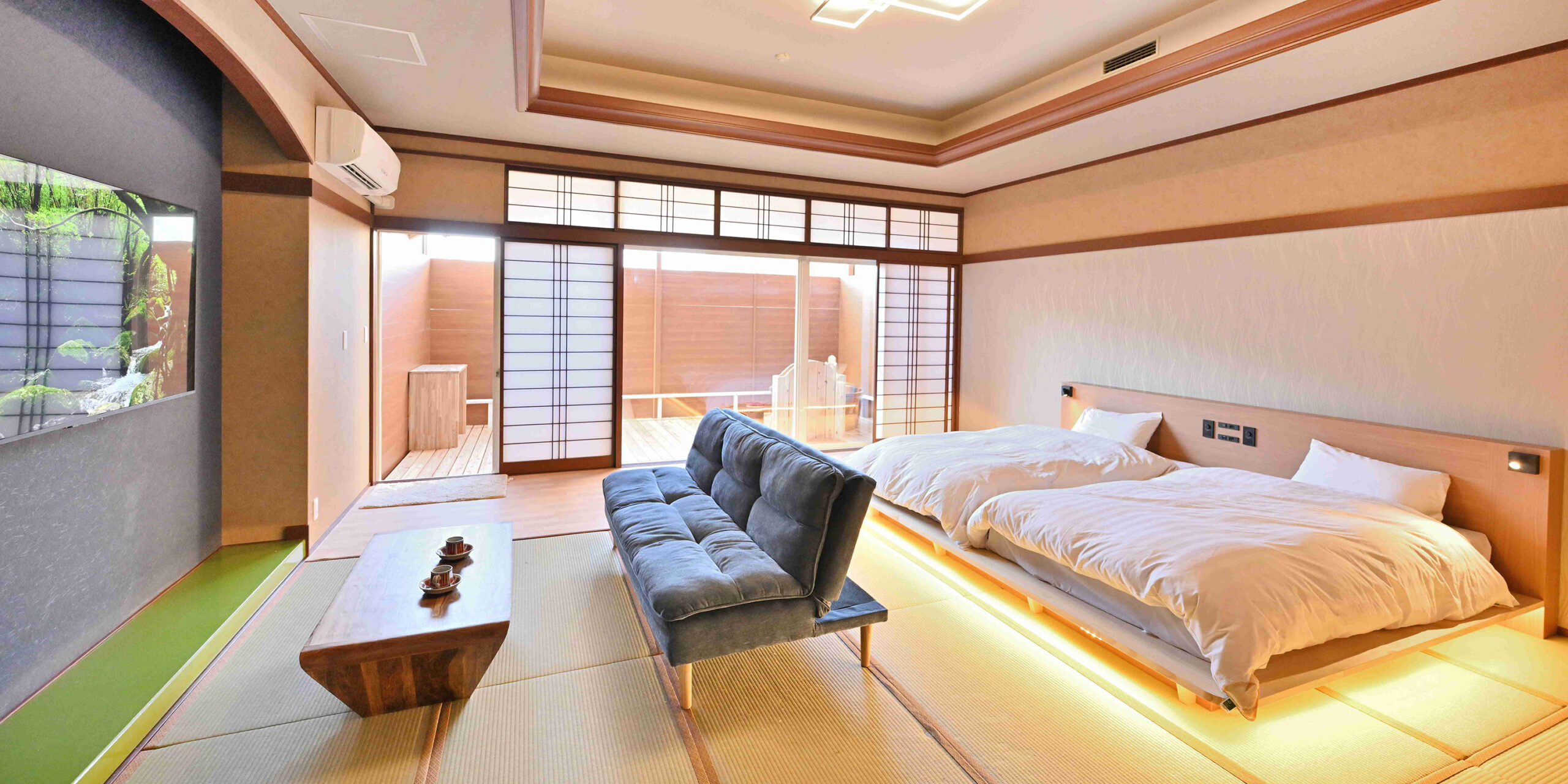 当館の温泉は強アルカリのお肌すべすべの美人の湯と心身ともに整える中性温泉の組み合わせで、温泉三昧をお楽しみください。筑後川の中流域にある自然豊かな田舎の湯治場でごゆっくりお過ごしください。