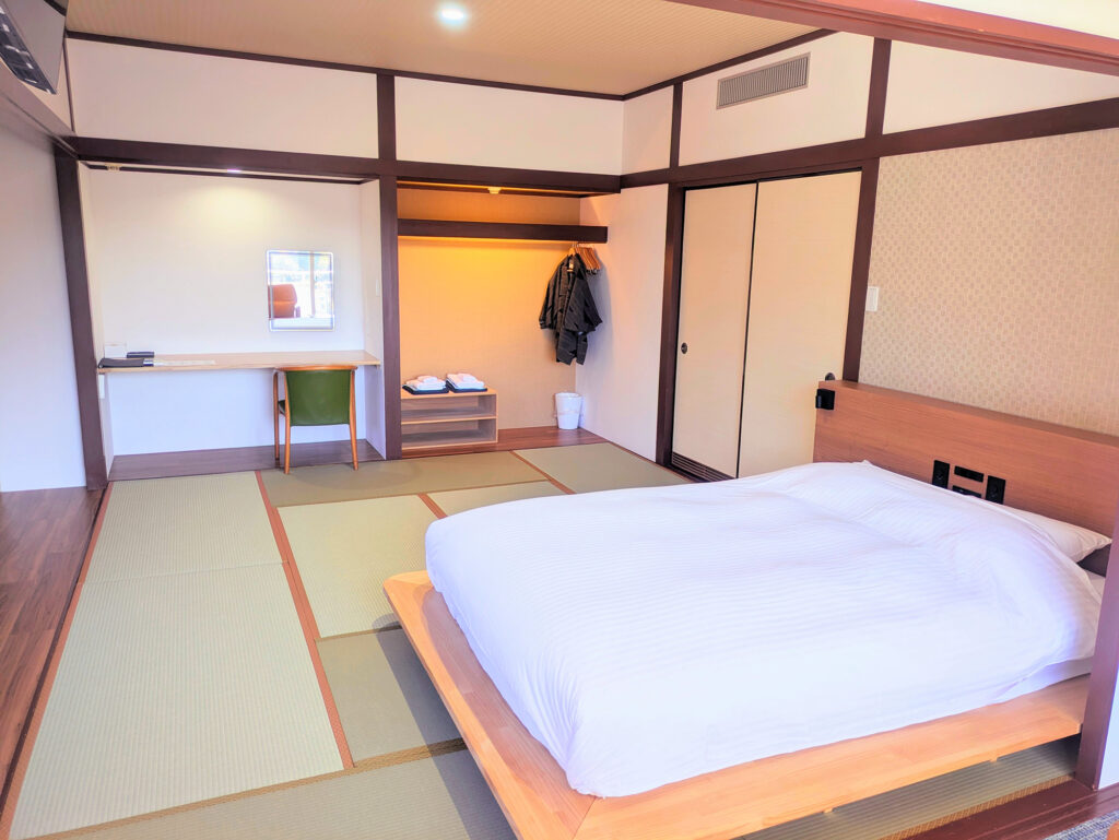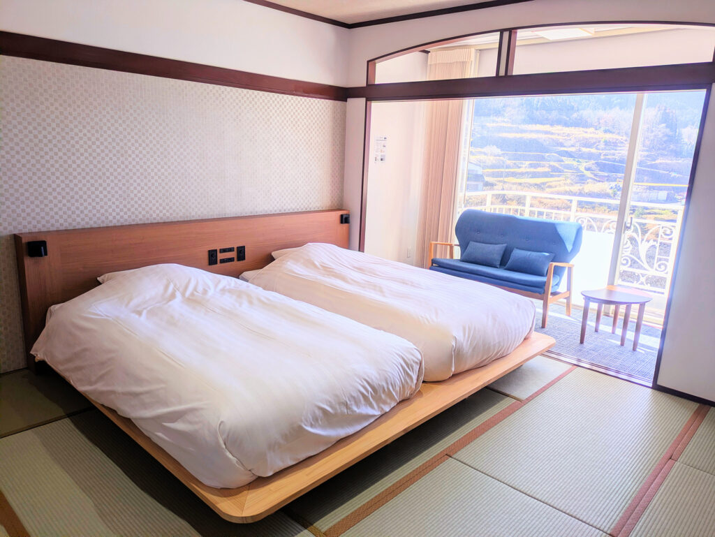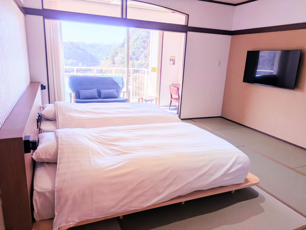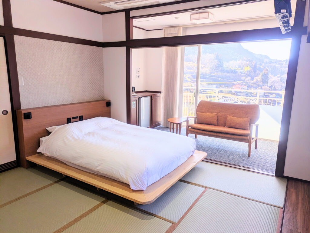 クイーンサイズのベッドを小上がりに1台備えた客室。1〜2名様のご利用をおすすめしております。5階の角部屋で温泉街も山側も堪能いただけます。