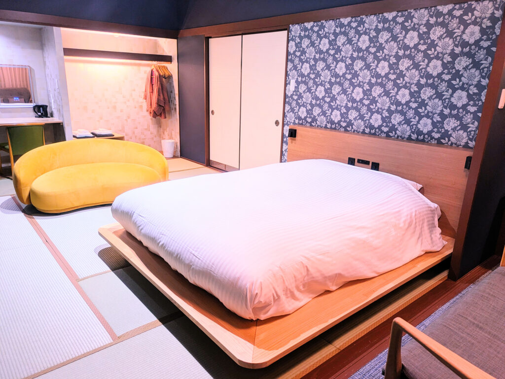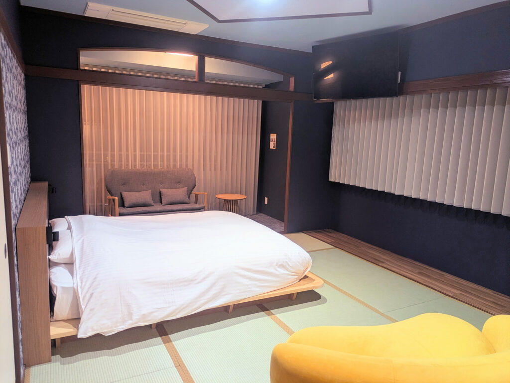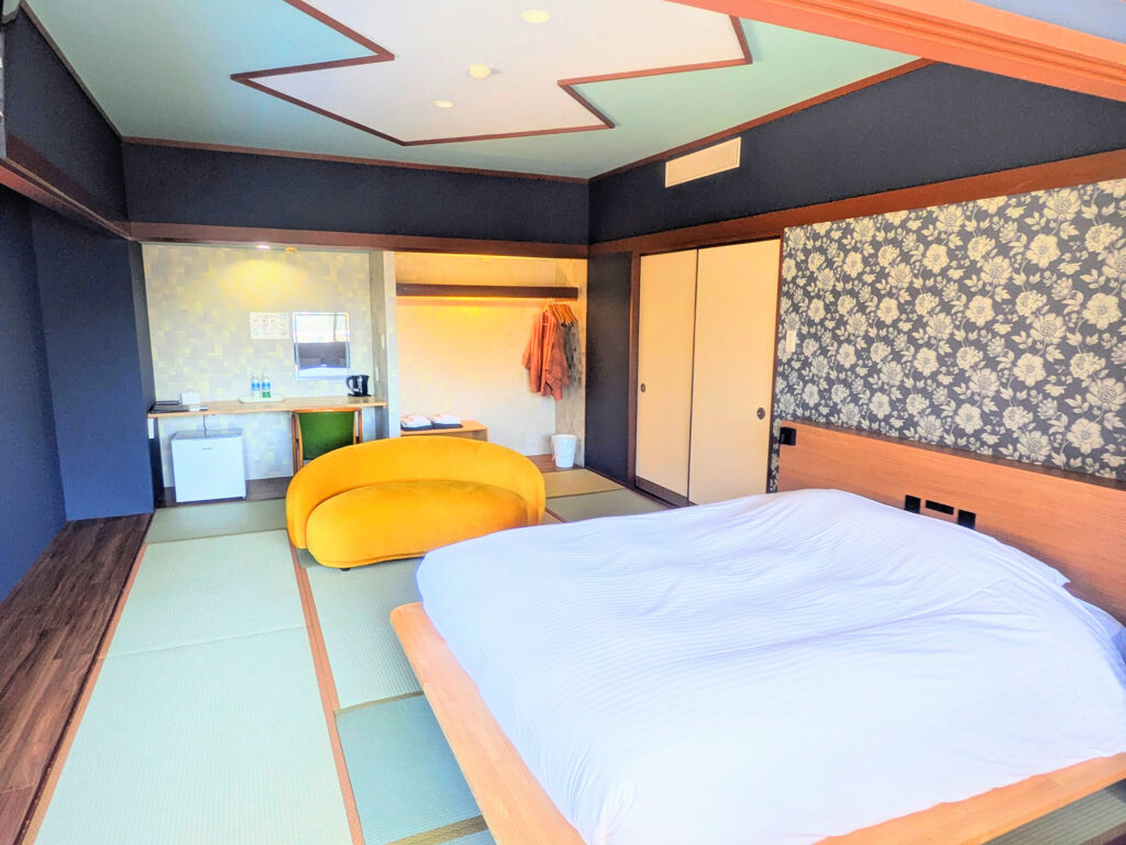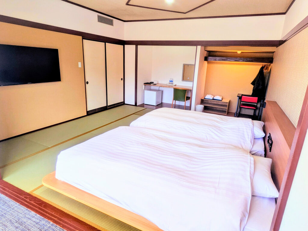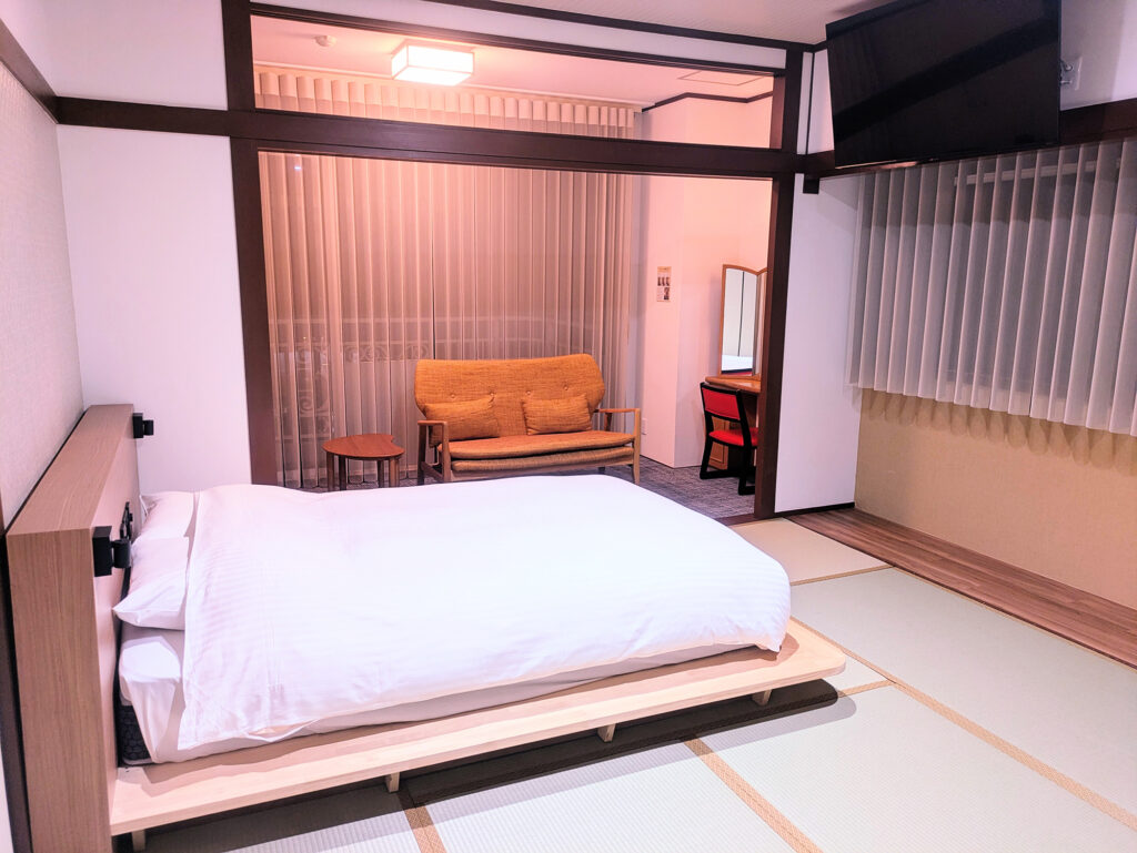 クイーンサイズのベッドを小上がりに1台備えた客室。1〜2名様のご利用をおすすめしております。5階の角部屋で温泉街も山側も堪能いただけます。