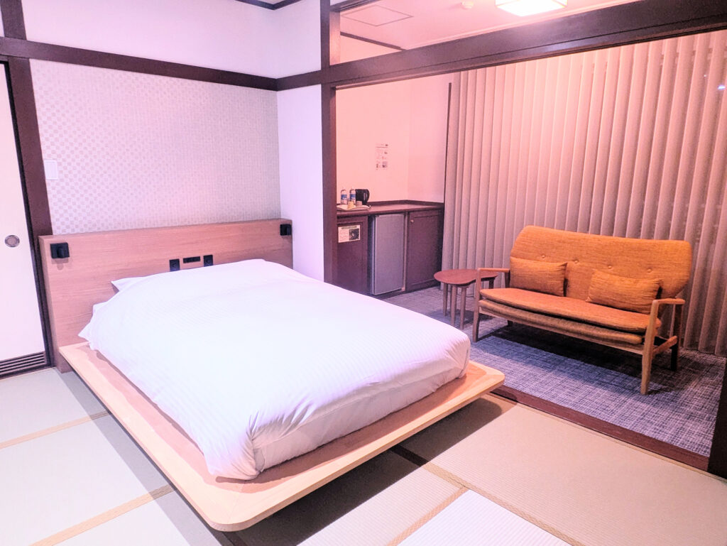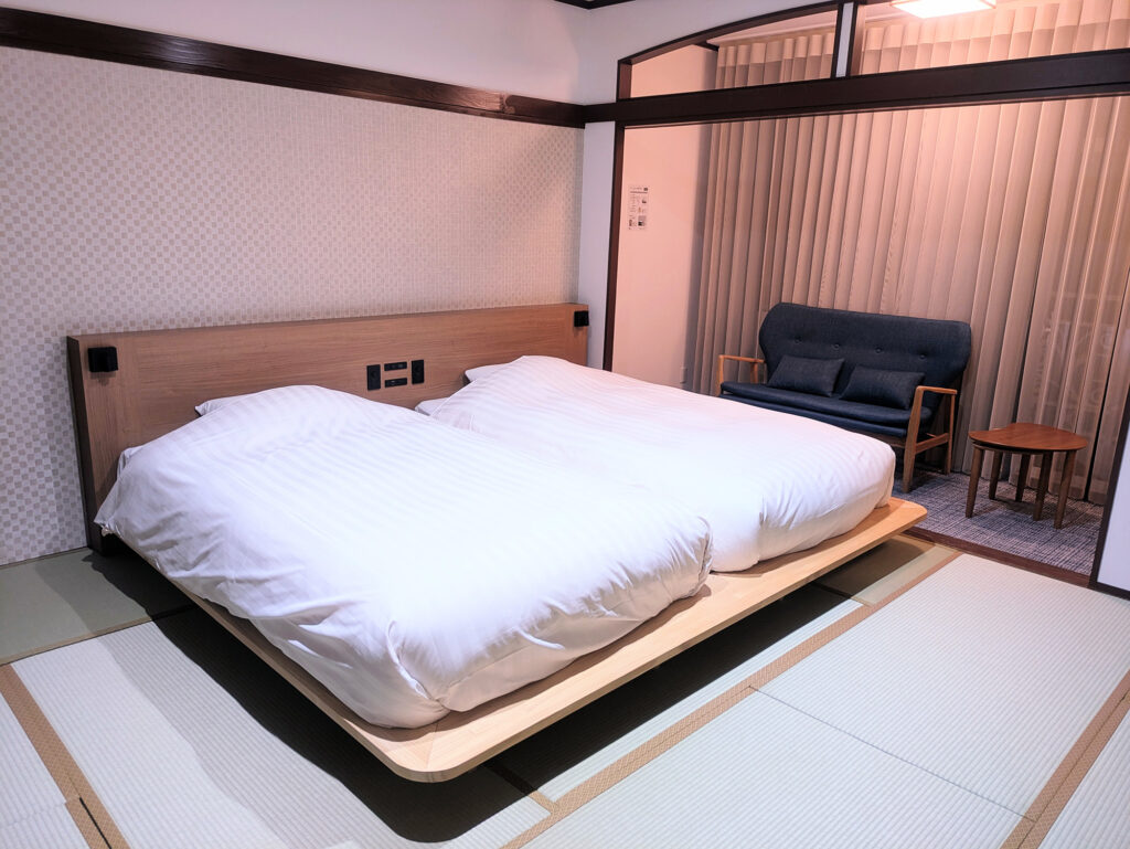 セミダブルのベッドを小上がりに2つ並べた和モダンスタイルの客室。2名様ご利用であればゆったりと過ごすことができます。3名様ご利用時はエキストラベッドをご用意いたします。