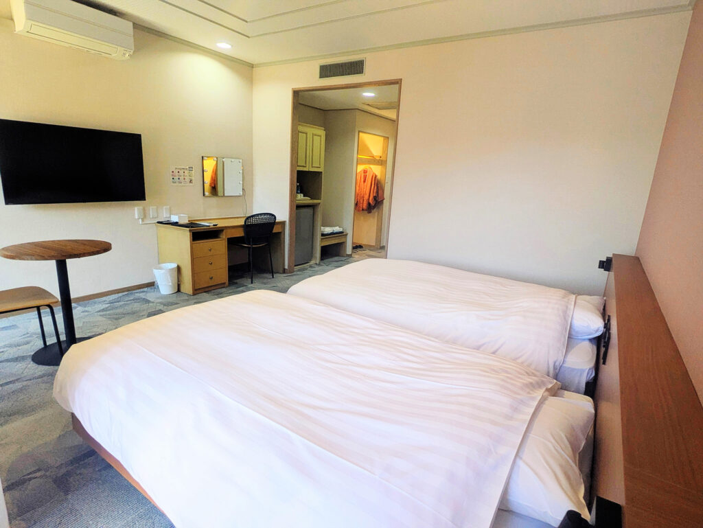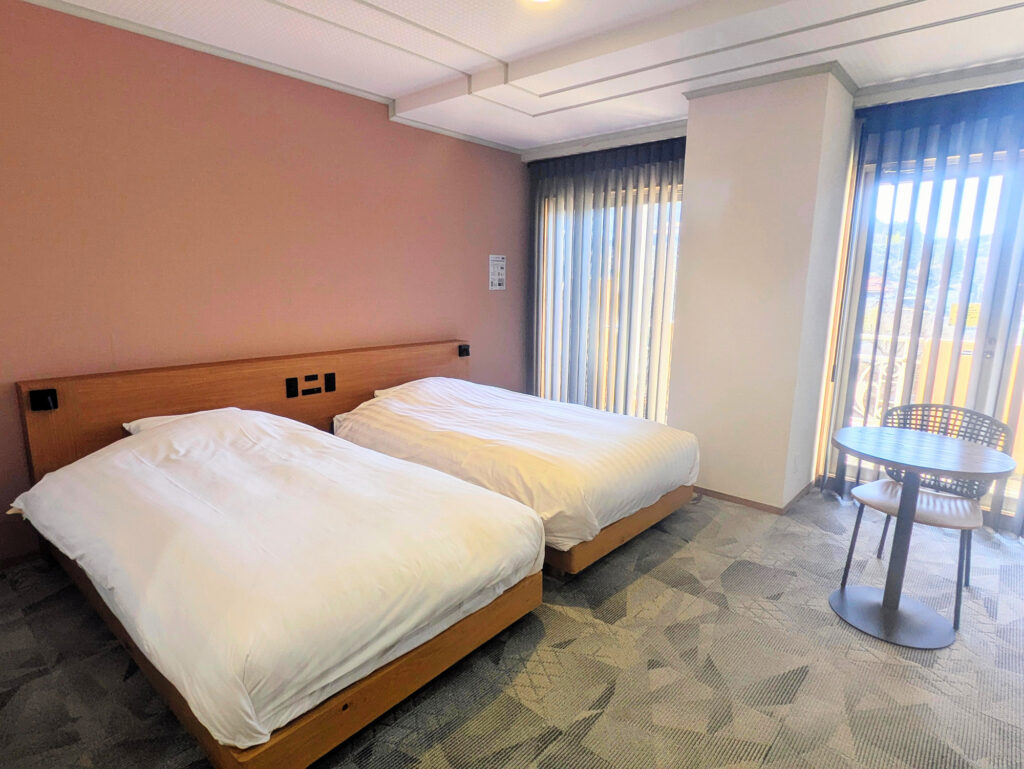 セミダブルサイズのホテルベッドを2台備えた客室。ドアからベッドまで車椅子で移動できるお部屋です。定員は2名様までです。